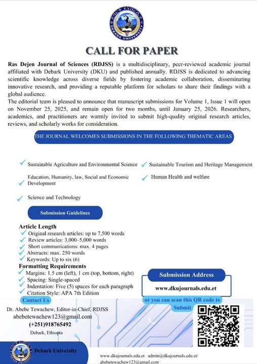The Ras Dejen Journal of Sciences (RDJSS), a peer-reviewed, open-access multidisciplinary journal run by Debark University, cordially invites scholars, researchers, and academics from around the world to submit original research articles, review papers, and short communications for its inaugural issue (Volume 1, Issue 1).